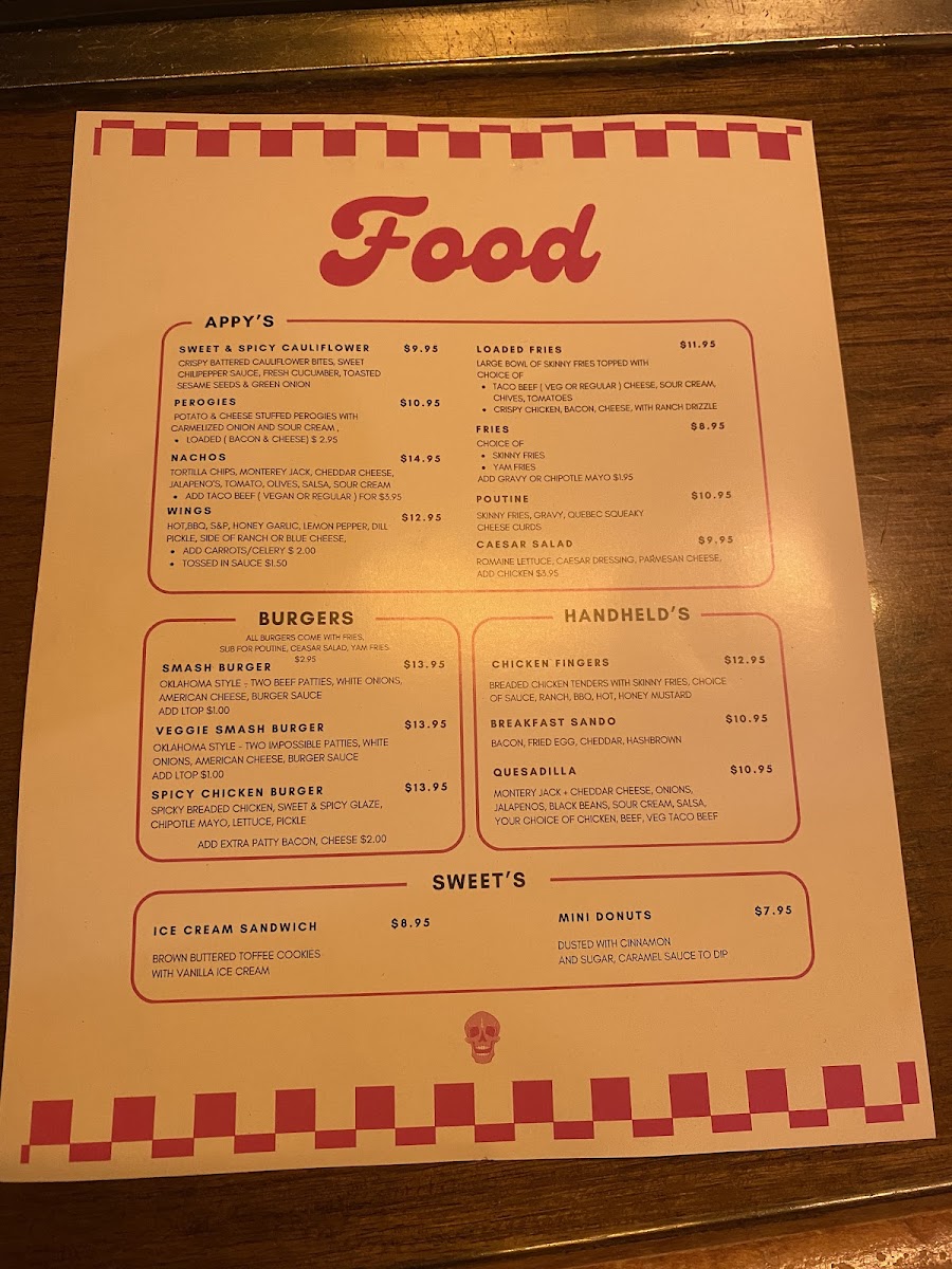 Starters feature items such as poutine with maple glazed bacon, sweet and spicy cauliflower bites served with a chili pepper sauce, and nachos topped with cheddar, Monterey Jack cheese, jalapeños, and southwestern bean dip.
