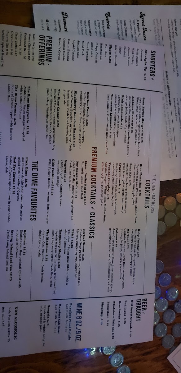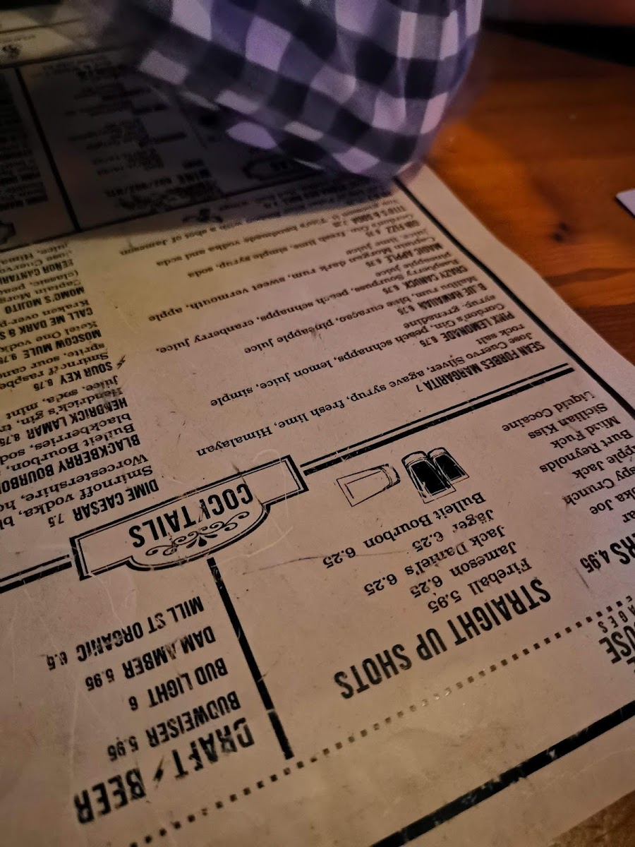 The drink selection, typical of a bar and grill, includes a variety of cocktails such as the Cosmopolitan Martini, Jaegerbomb, and Old Fashioned, as well as beer options like Lucky Lager and local craft brews. Additionally, wine-based drinks like Red Sangria are available.